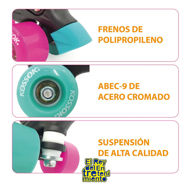 cromado, garantizan una rotación eficiente, mejorando la fluidez del patinaje. El chasis y los frenos, hechos de PP, ofrecen una estructura ligera y resistente. Estos patines soportan un peso máximo de 70 kg, lo que los hace adecuados para una amplia gama de usuarios a partir de los 3 años.